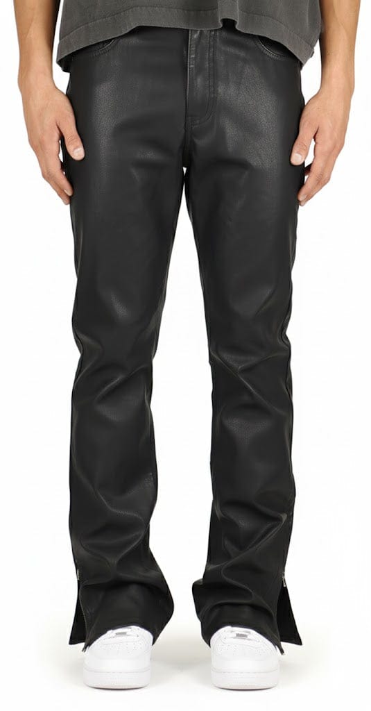 Our faux leather pants are made for style and function. Crafted from premium faux leather in sleek black, a high-waisted, wide-leg fit and a subtle flare cut. Versatile and edgy, pair them with tailored pieces for a bold look or a tee and boots for rugged charm. Fully lined for comfort.