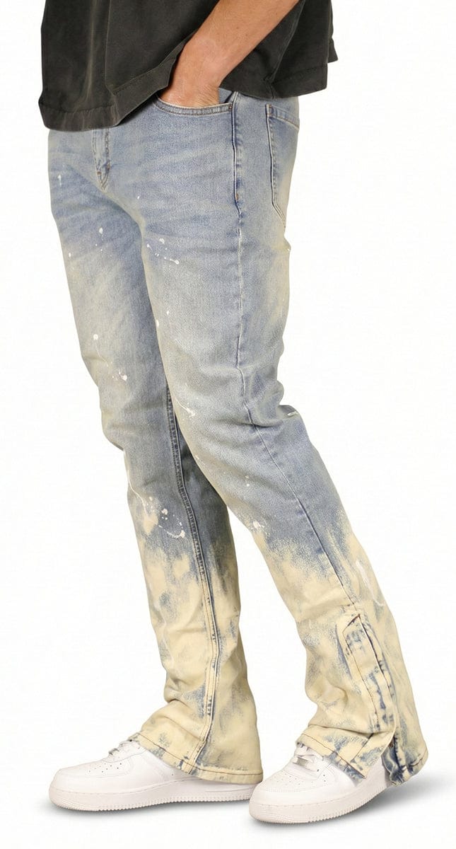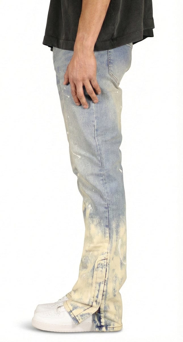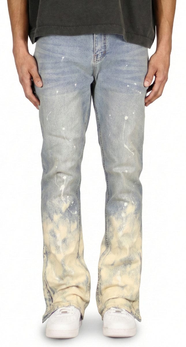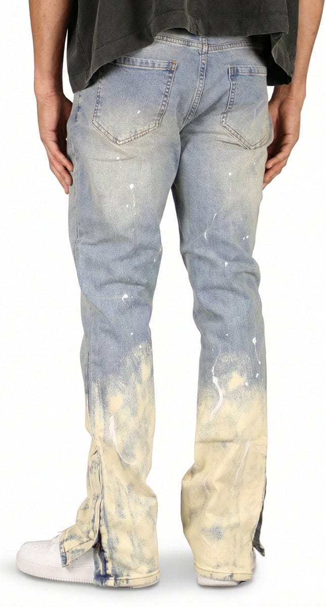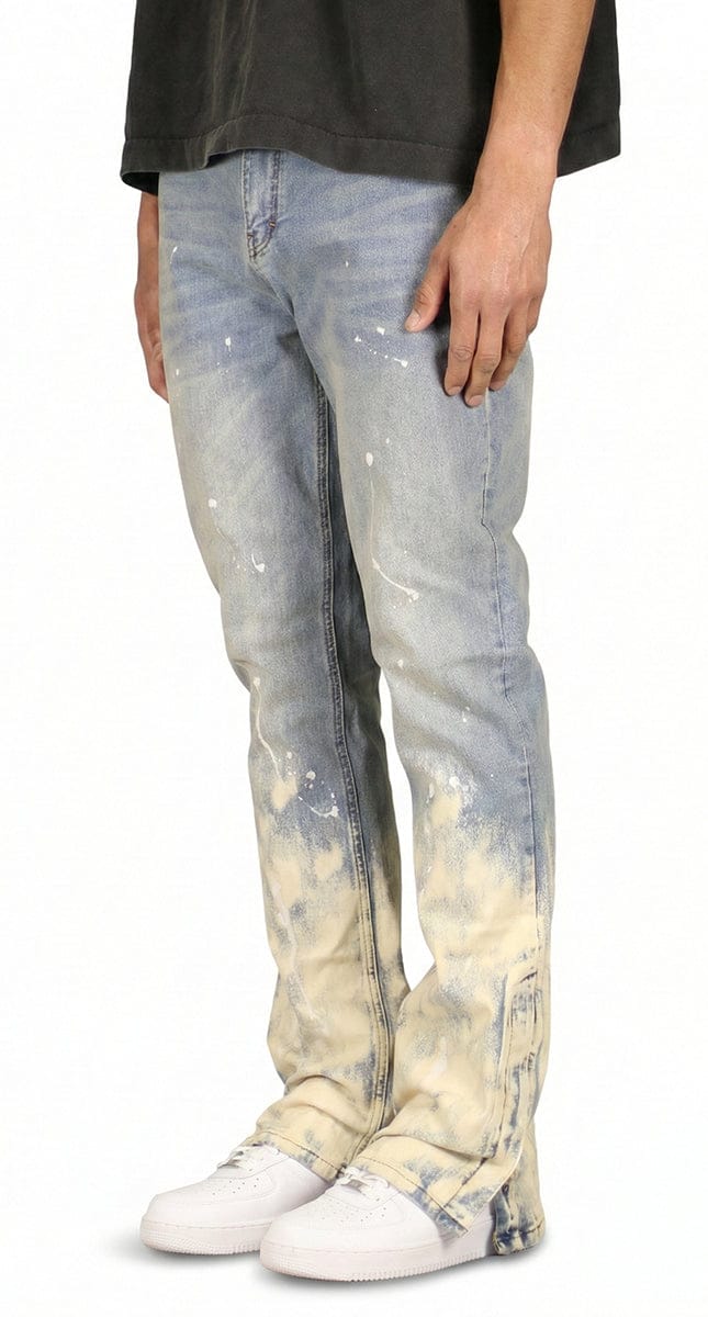 Slim fit with a slight flare. Finished with bold bleach-washed gradient and paint splatter finish that mimics the rise of a blue flame. and zipper hems for a worn-in, standout look.