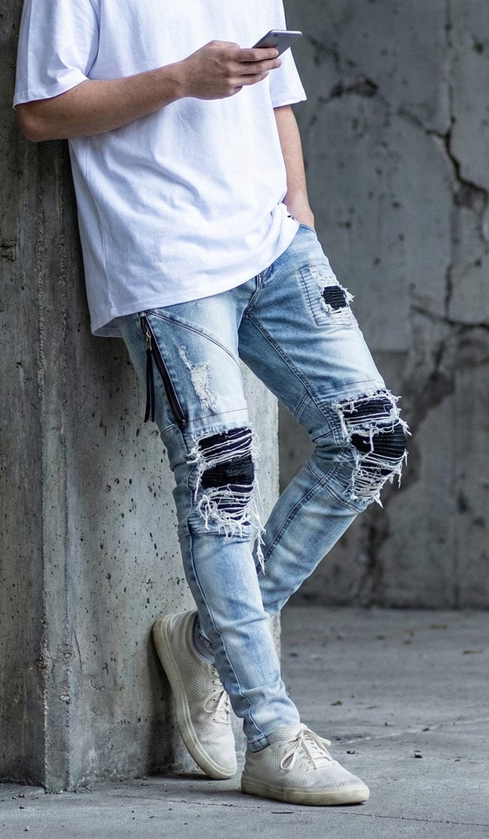 The LT. Blue Lozy Jeans feature heavy-distressed light-blue denim with black leather biker patch underlays, giving a bold contrast look. Crafted from premium stretch denim for a stacked skinny fit and maximum comfort.